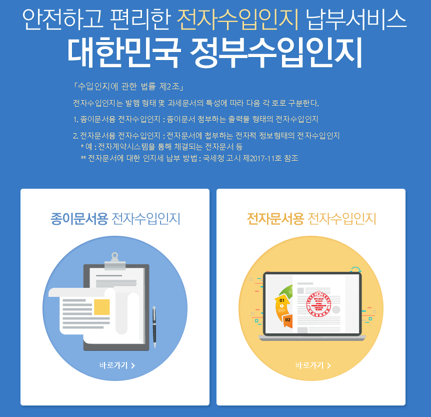 전자수입인지 납부서비스 개념으로 행정 업무 요청을 하기 위해서 미리 행정 수수료를 납부하여 정부수입인지를 출력하여 제출하는 방식이라고 생각하시면 됩니다.