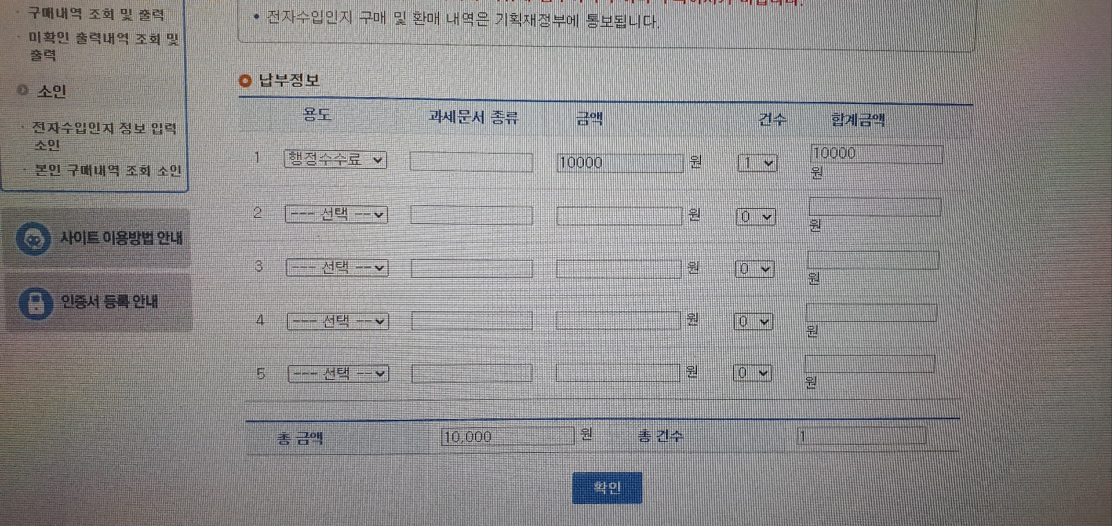 5) 전자수입인지(종이 문서용 전자수입인지 1만 원-행정수수료용)