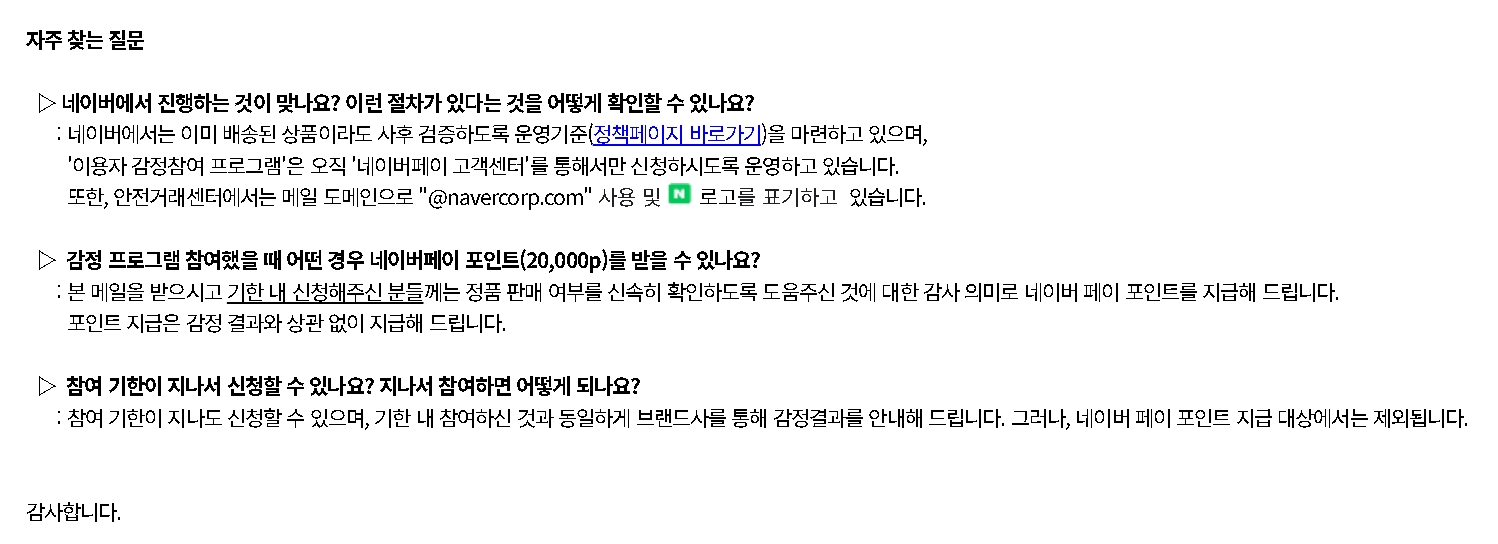 혹시나 저처럼 네이버 안전거래센터에서 메일이 날아오신 분들 중 감정 프로그램에 참여하실 분들은 몇 가지 주의사항이 있다.