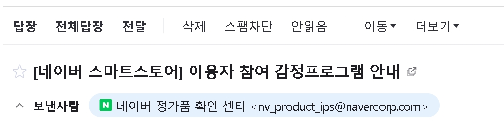 그런데 며칠이 지나서 네이버 안전거래센터에서 네이버 스마트스토어 이용자 참여 감정프로그램 안내 메일이 왔다