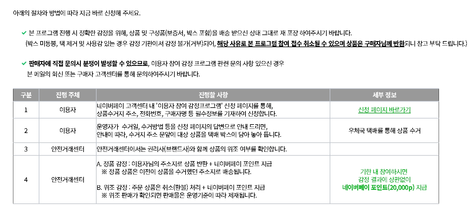 모든 것이 공짜인데 아쉬운 점은 아무나 참여는 불가능하고 네이버 안전거래센터에(네이버 정가품 확인 센터)서 직접 대상자를 선정해서 메일이 오는 시스템이다.