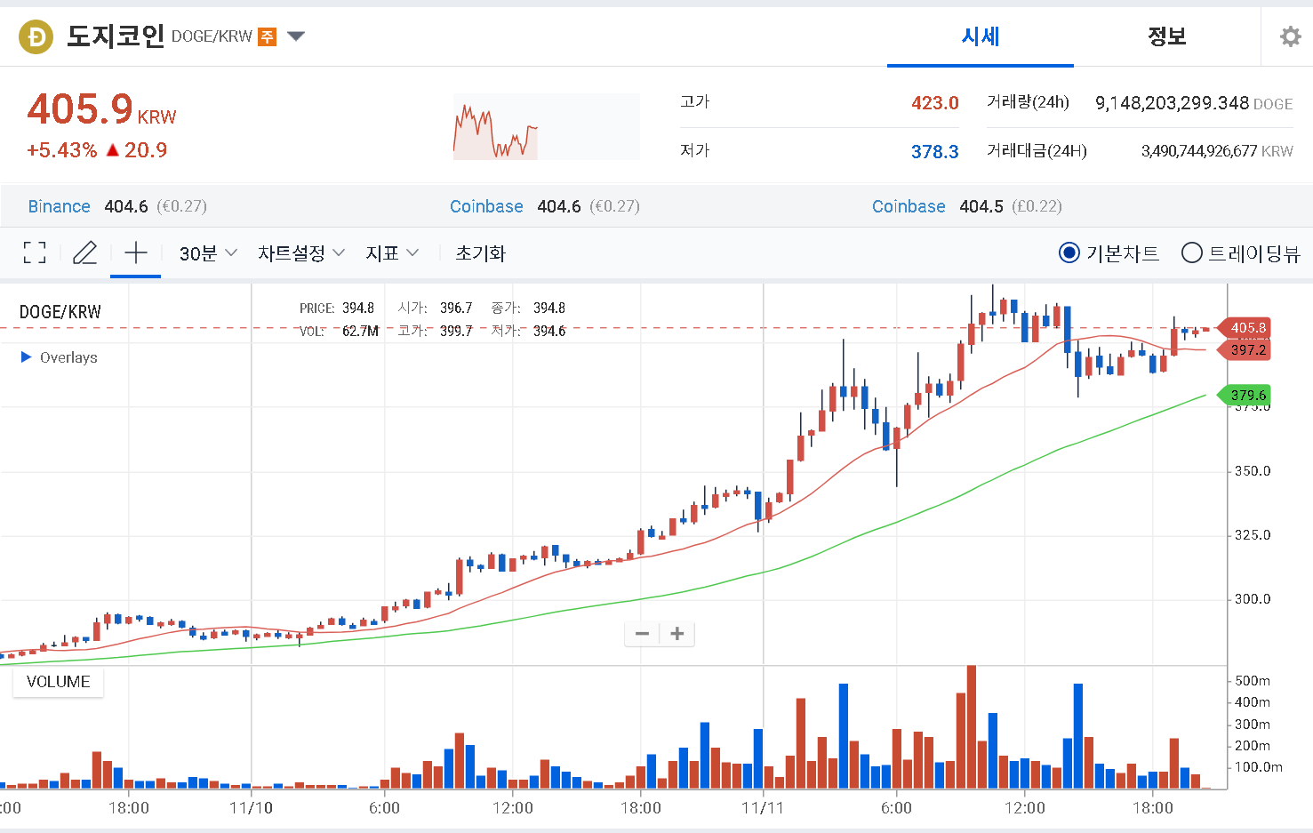 도지코인 현재 시세는 405원이며 전일대비 21.2원(5.40%) 상승하였습니다.