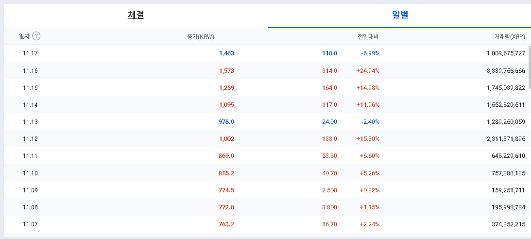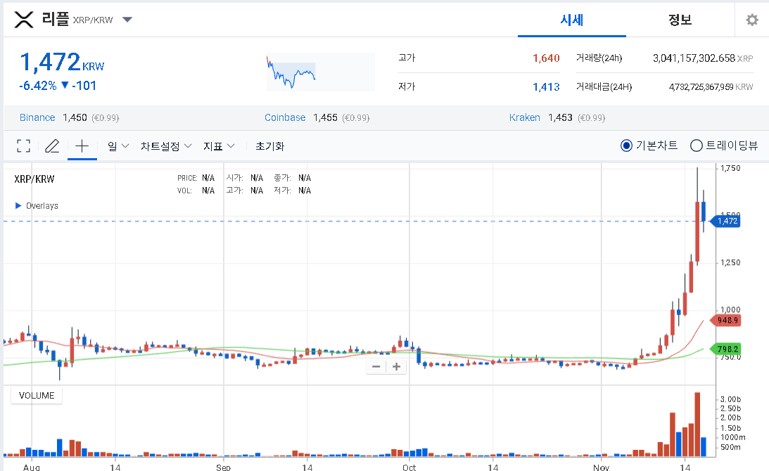 현재 리플코인 시세는 1,470원이며 전일대비 -102원(-6.36%) 하락하였지만 불과 일주일전과 비교하면 높은 수즌으로 급등한 상태입니다.