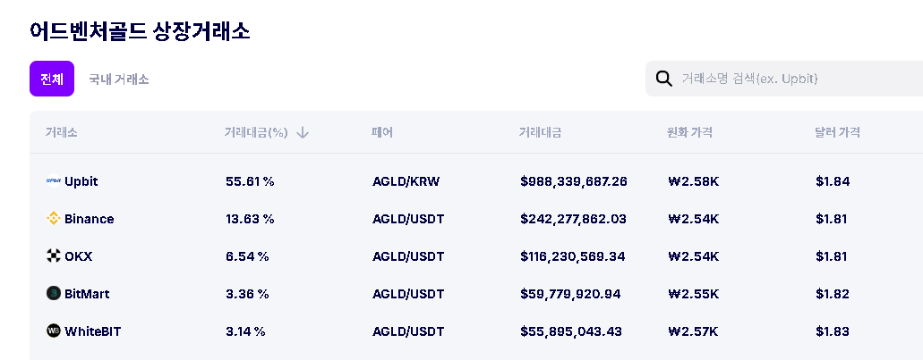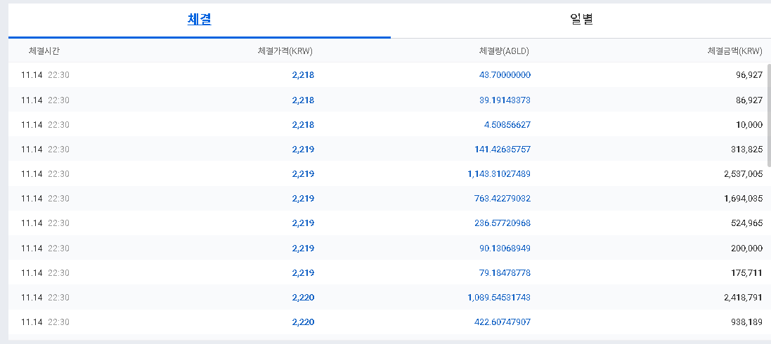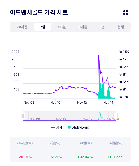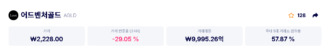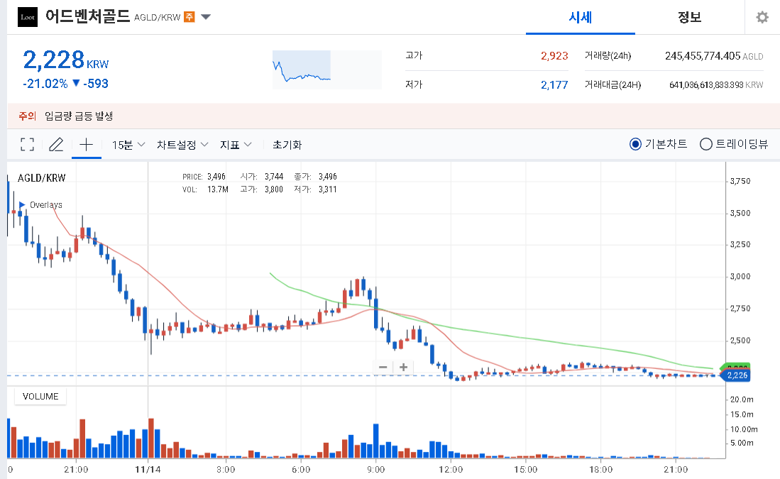 어드벤처골드 코인이 13일 날 드디어 상장이 되었습니다. 상장 당일 180% 이상 가격이 올랐으며 현재 가격은 조금 떨어진 상태에서 2,200원대를 유지하고 있습니다.