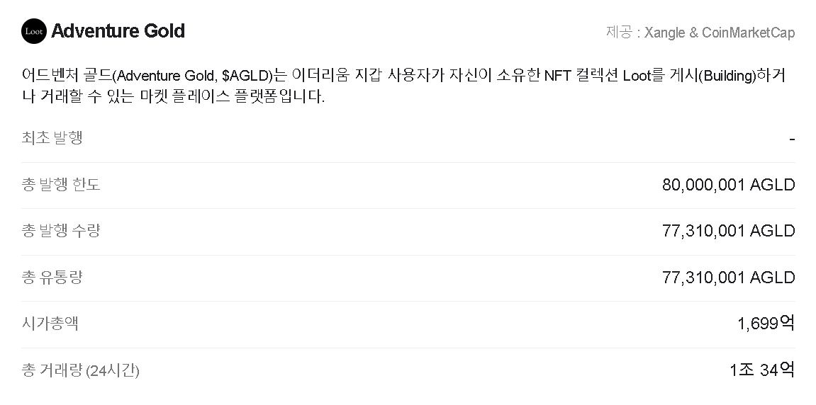 어드벤처골드는 루트 NFT 생태계에서 사용되는 가상자산입니다. 루트는 전리품이라는 뜻으로 8개의 아이템이 텍스트 형태로 담겨 있는 총 8,000개가 발행된 NFT입니다.