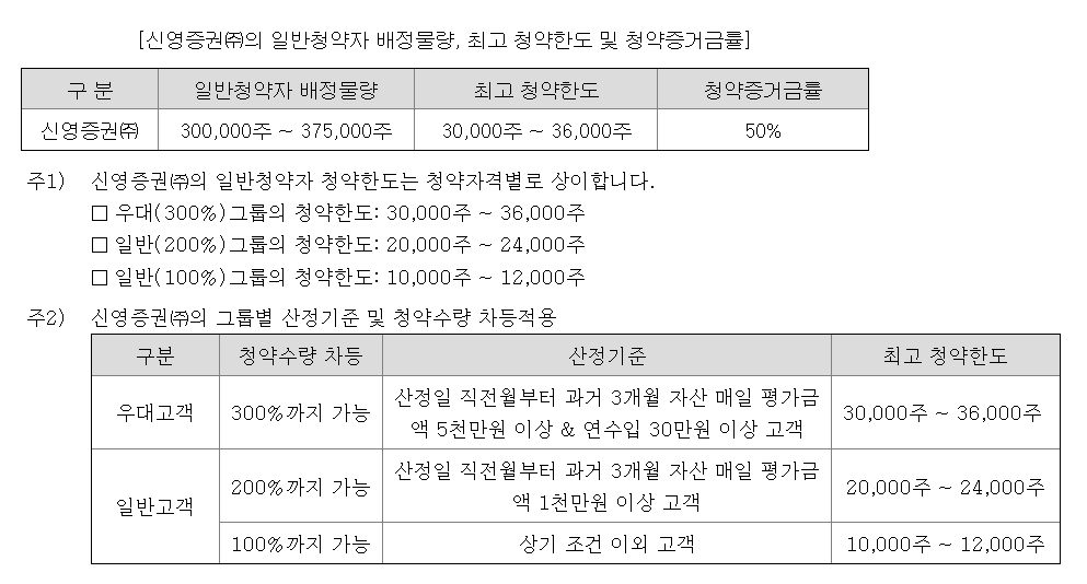 신영증권 일반청약 배정물량은 300,000주~375,000주이고 청약한도는 30,000~36,000주입니다.