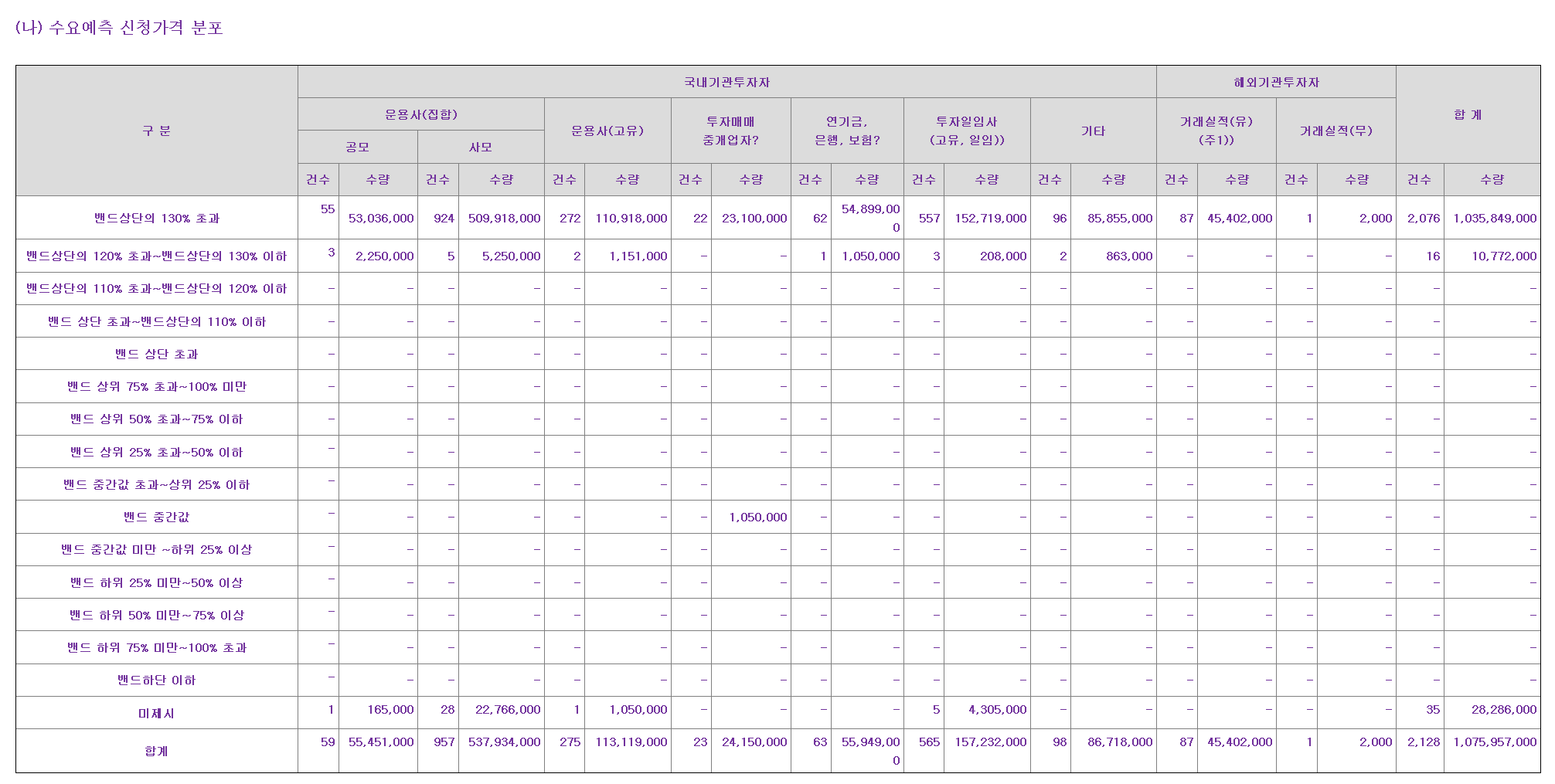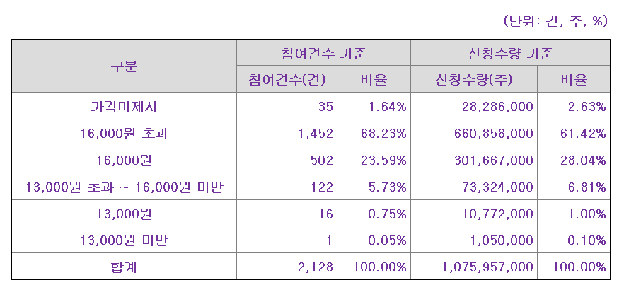 수요예측 신청가격 분포는 밴드상단의 130%를 초과하였으며 건수는 2,076건입니다.