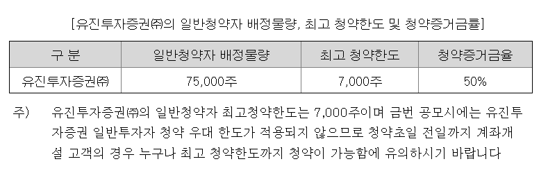 유진투자증권 일반청약 배정물량은 75,000주이고 최고 청약한도는 7,000주입니다.