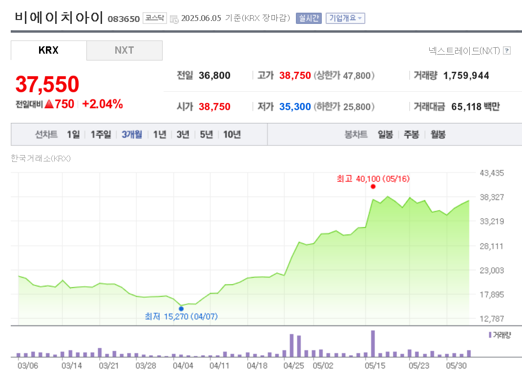 현재 주가는 37,550원이며 전일대비 750원(+2.04%) 상승했습니다. 고가 37,750원 저가 35,300원입니다.