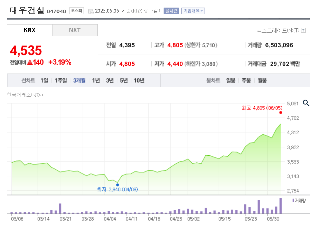 대우건설 현재 주가는 5,535원이고 전일대비 140원(+3.19%) 상승하였습니다. 고가 4,805원 저가 4,440원입니다.