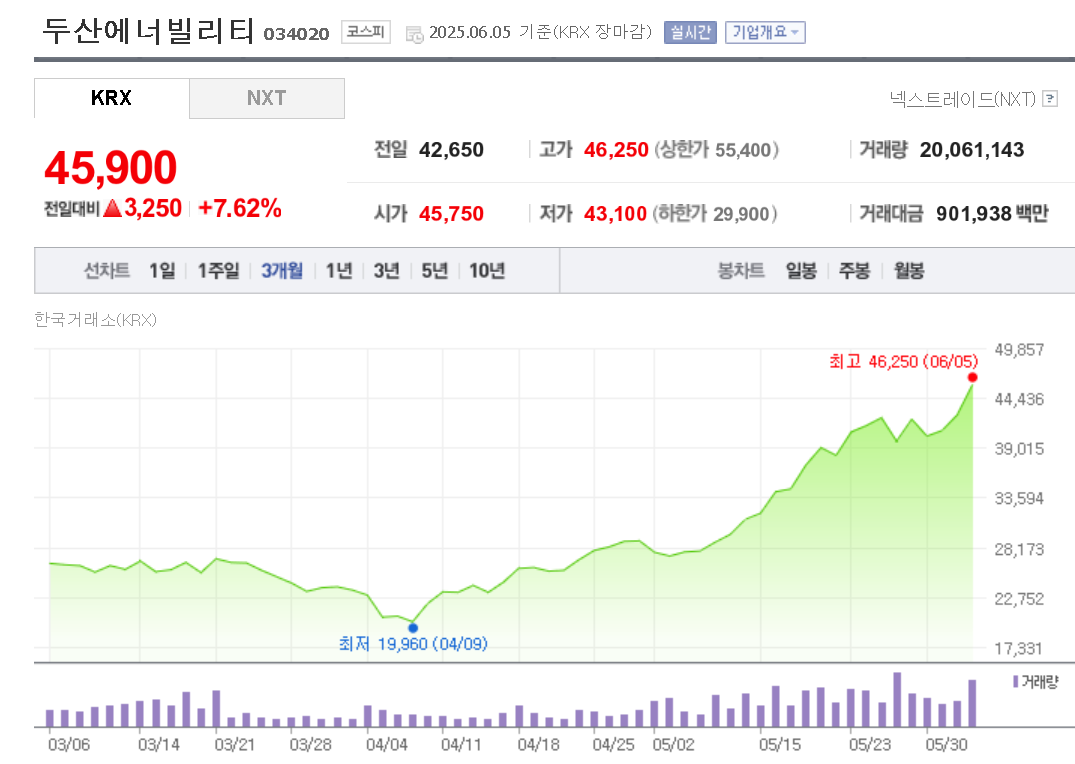 두산에너빌리티는 이번에 대박을 치고 있는 상태입니다. 현재 주가는 45,900원이고 전일대비 3,250원(7.62%)이 상승했습니다.