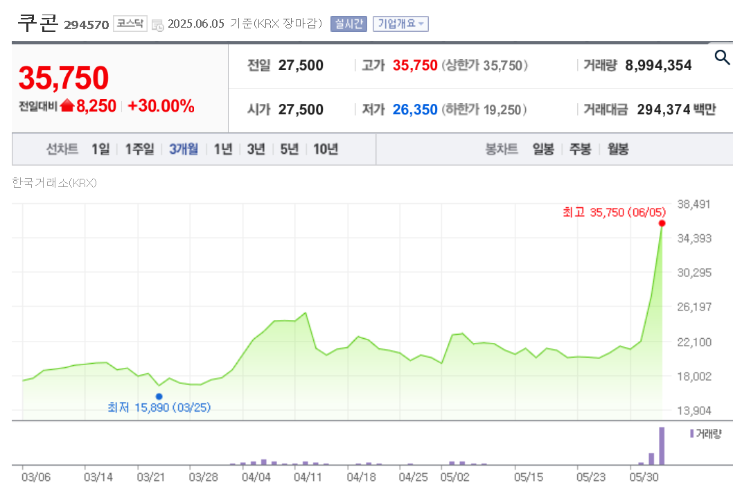 쿠콘 현재 주가는 35,750원이고 전일대비 8,250원(+30%) 상승하였습니다. 고가 35,750이고 저가 26,350원입니다.