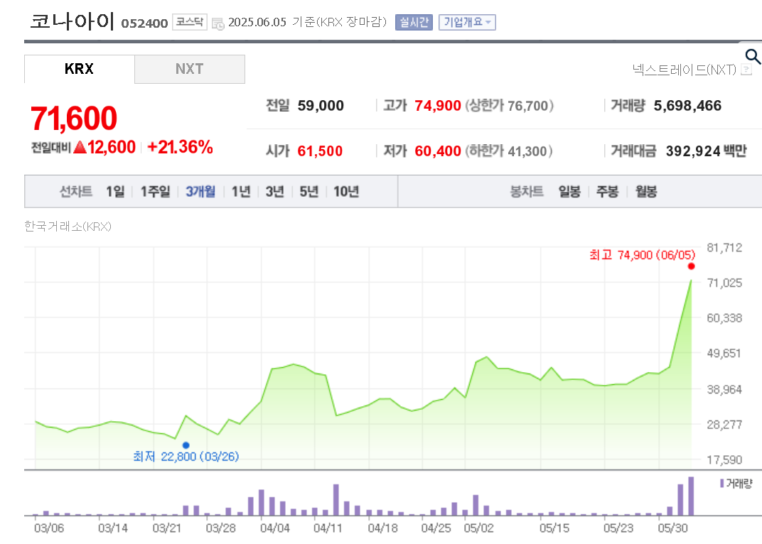 코나아이 현재 주가는 71,260원이고 전일대비 12,600원(+21.36%) 상승하였습니다. 고가 74,900원 저가 60,400원입니다.