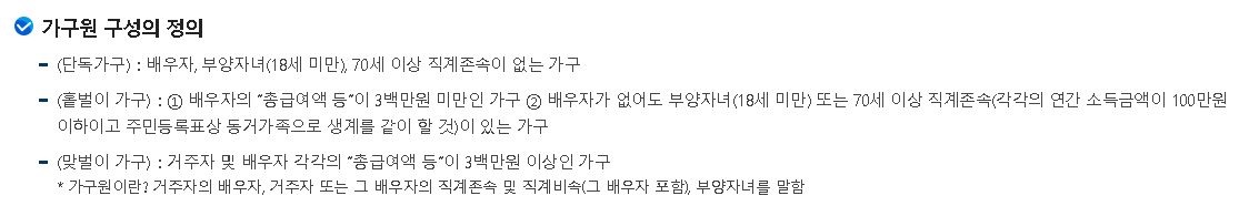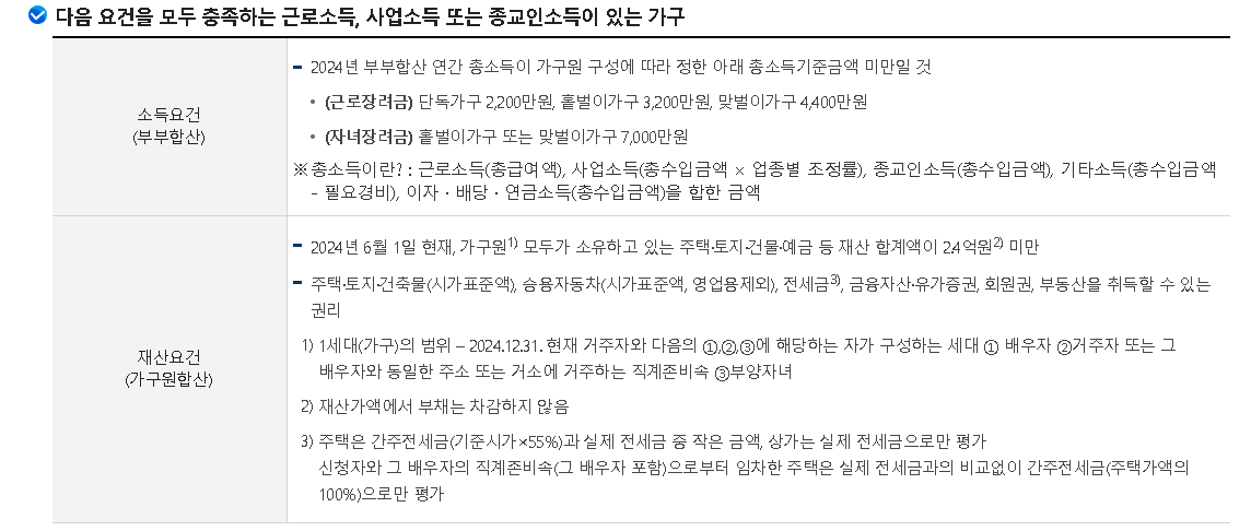 재산요건은 가족 구성원 전체를 기준으로 재산 합계약이 2.4억 원 미만입니다.
