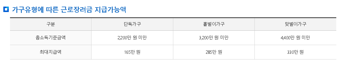 근로장려금 지급금액은 근로소득, 사업소득, 종교인 소득 구분과 단독가구, 홑벌이 가구, 맞벌이 가구 기준이 다르며 부부합산소득을 기준으로 최대 지급금액은 단독가구 165만 원, 홑벌이 가구 285만 원, 맞벌이 가구 330만 원이 지급됩니다.