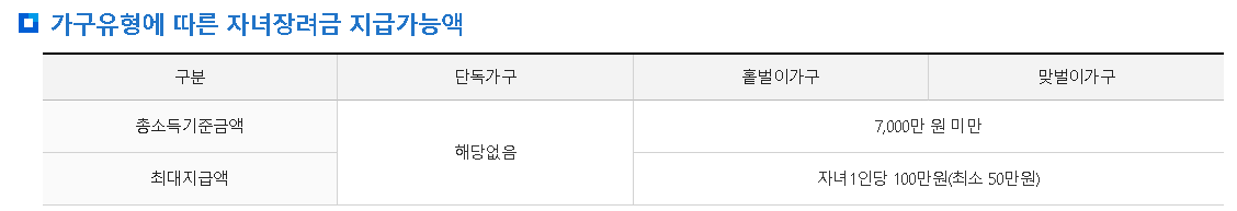 자녀장려금 소득요건은 홑벌이 또는 맞벌이 가구 7,000만 원 미만입니다.