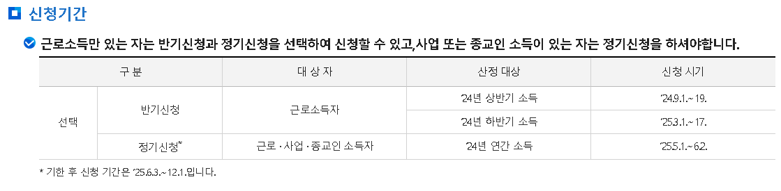 근로소득자는 상반기 하반기 신청을 나누어서 해도 가능하지만 사업, 종교인 소득자는 정기신청만 가능합니다. 이번 5월은 전체 대상자 신청이 가능하고 가장 많은 사람들이 신청하는 정기신청 기간입니다.