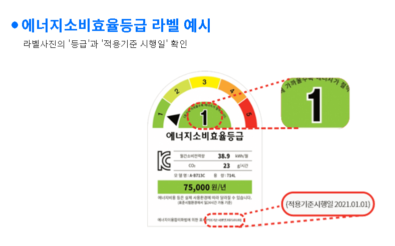 - 에너지 효율등급을 라벨에서 등급 및 적용기준 시행일을 확인