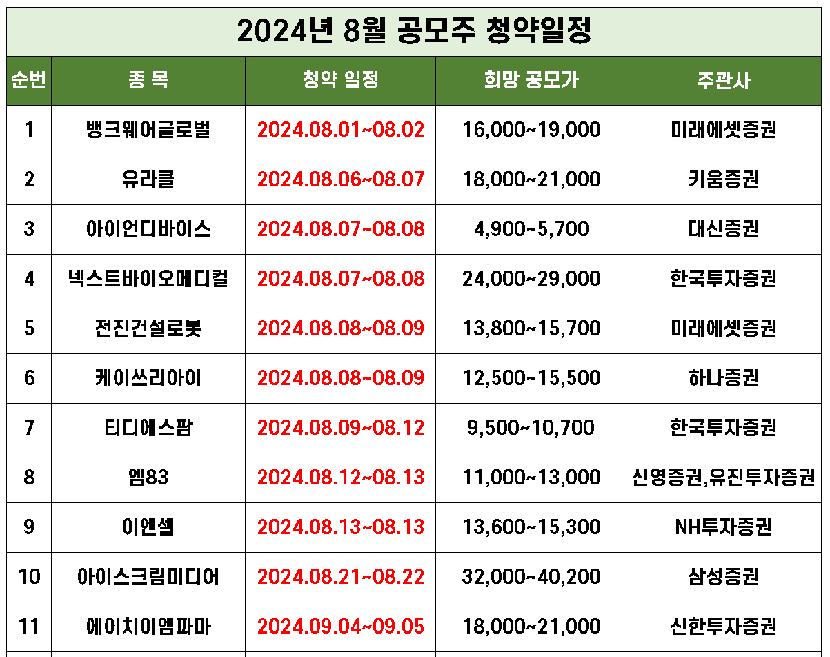 | 2024년 9월 공모주 청약일정 공모정보 (2) | 2024.09.03 |